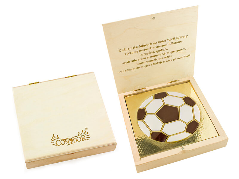 • możliwość bezpośredniego wytłoczenia prostego logotypu na centralnym elemencie piłki z ciemnej czekolady (dopłata za wykonanie formy)