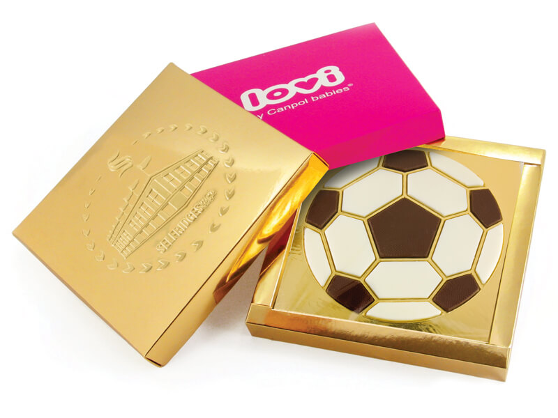 - możliwość bezpośredniego wytłoczenia prostego logotypu na centralnym elemencie piłki z ciemnej czekolady