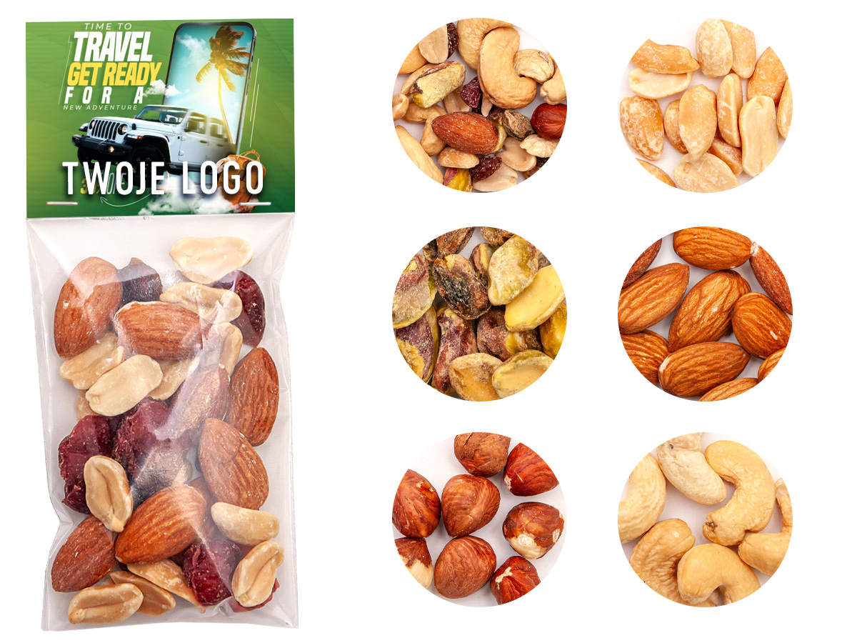 - w standardzie: mieszanka studencka, za dodatkową opłatą: pistacje solone, orzeszki ziemne solone, orzechy nerkowca, orzechy laskowe, migdały