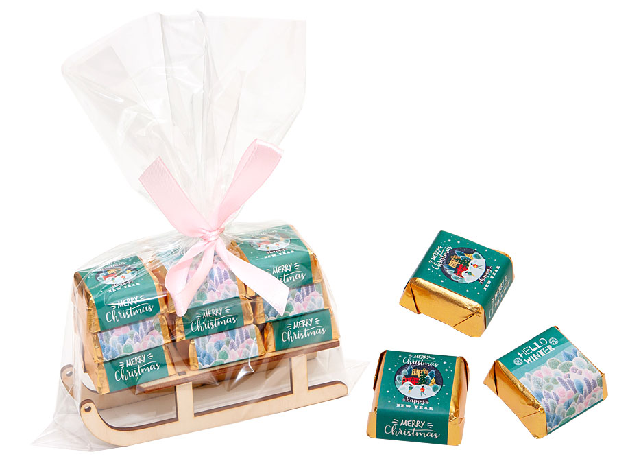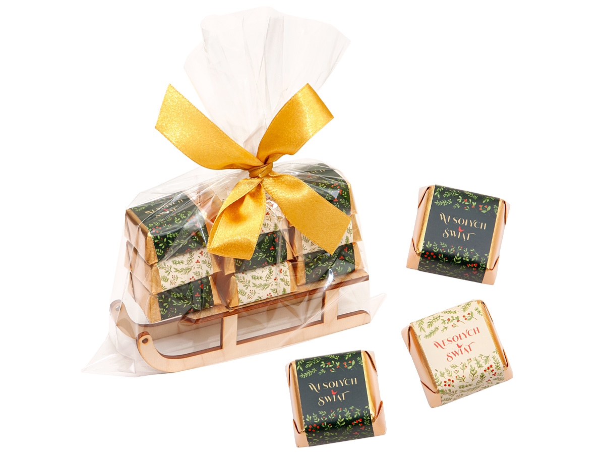 - Czekoladki ułożone na ozdobnych saniach ze sklejki