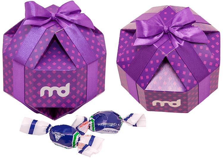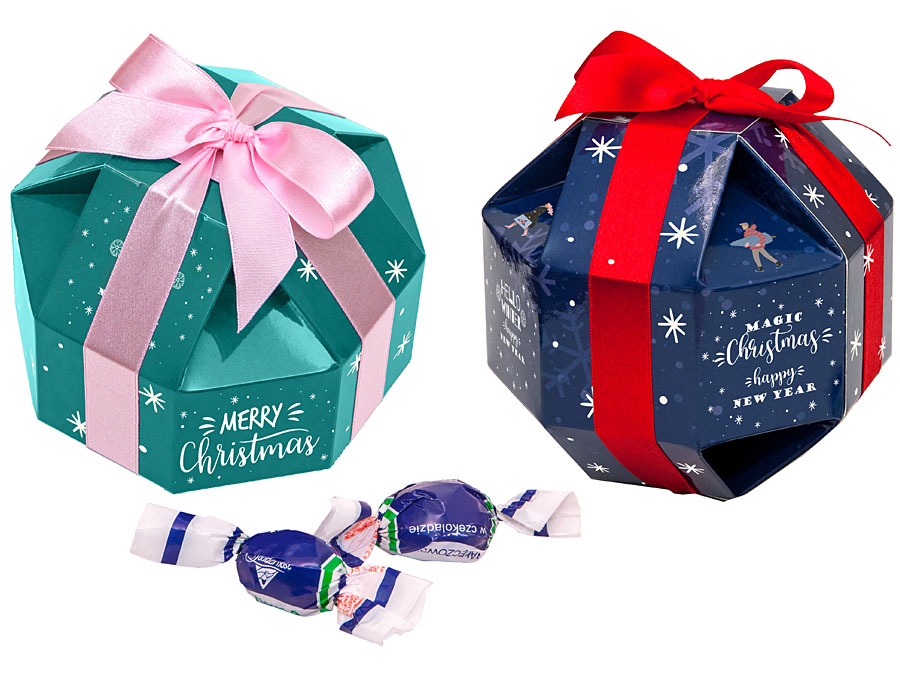 - intrygujące pudełko w kształcie zbliżonym do kuli, wypełnione śliwkami w czekoladzie