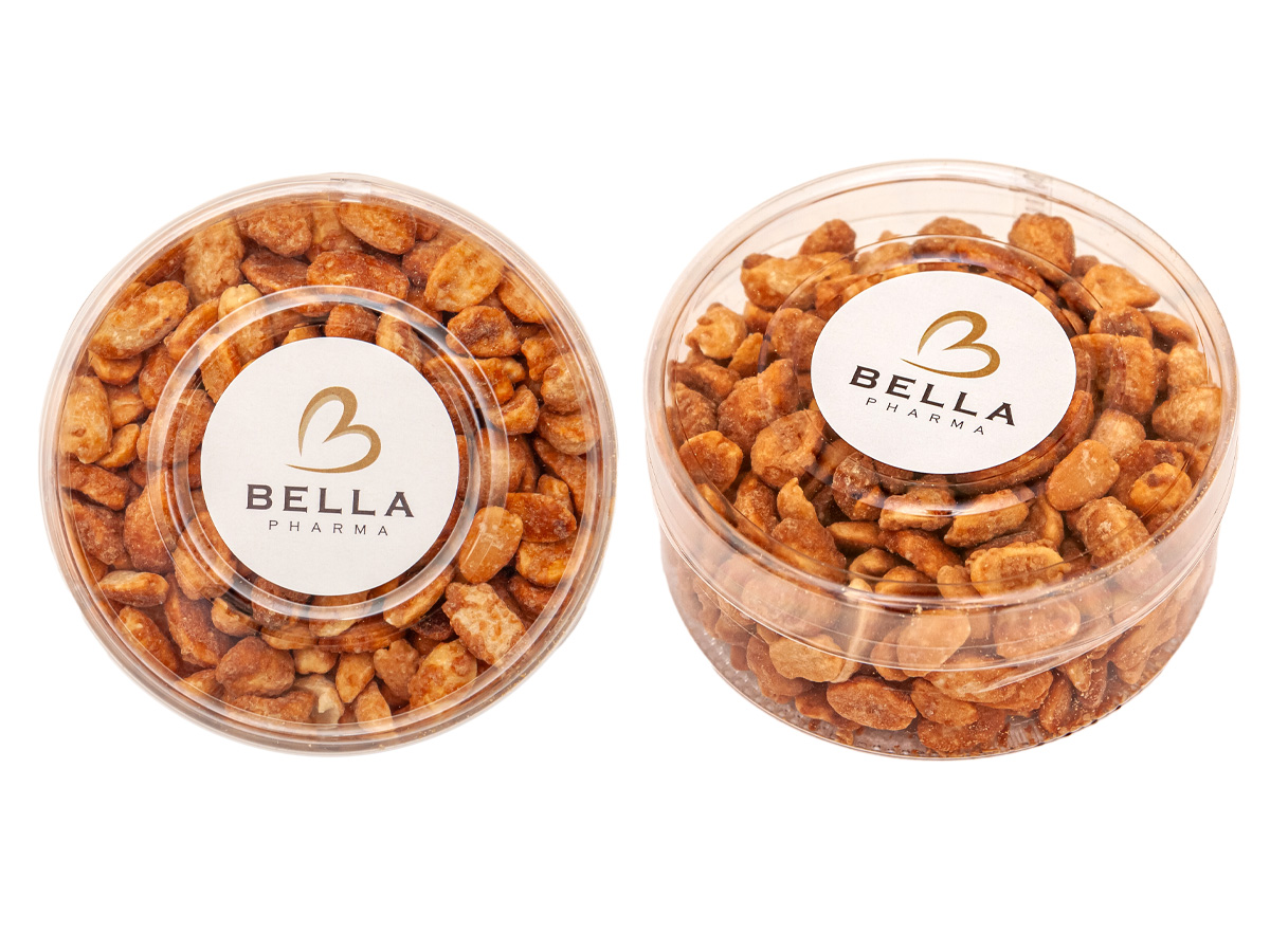 - na wieczku okrągła etykietka samoprzylepna z dowolnym nadrukiem reklamowym CMYK, z tyłu opakowania umieszczona mała, biała etykietka z informacjami o produkcie