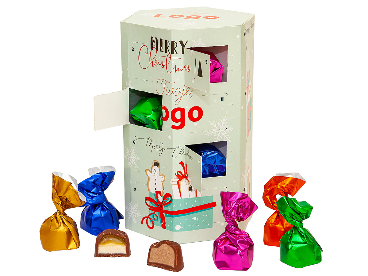 • sześciokątny kalendarz adwentowy zawierający 24 pralinki