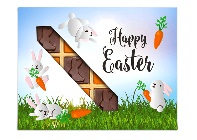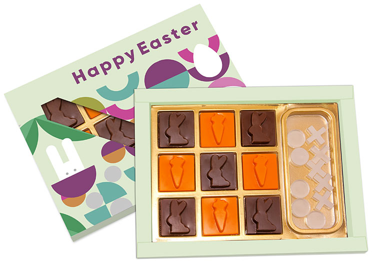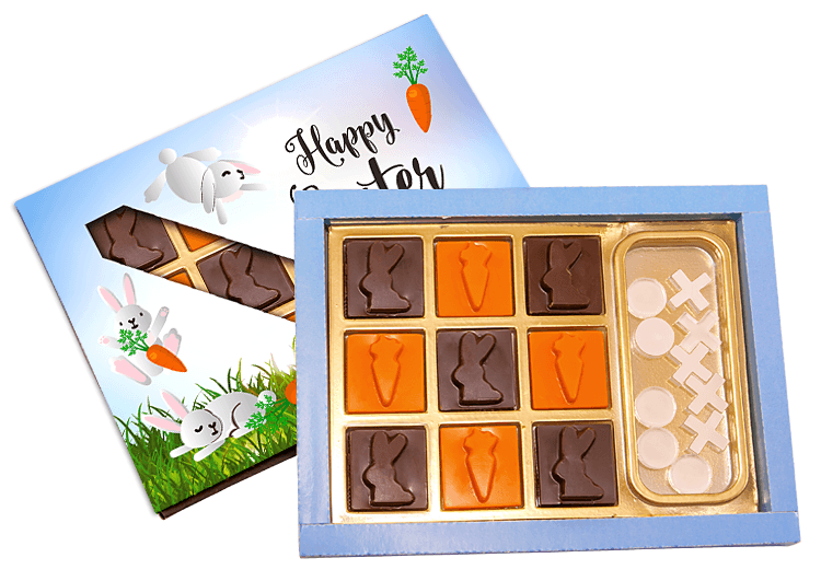 • Intrygująca bombonierka na wielkanoc zawierająca 9 czekoladek z motywami zajączka i marchewki