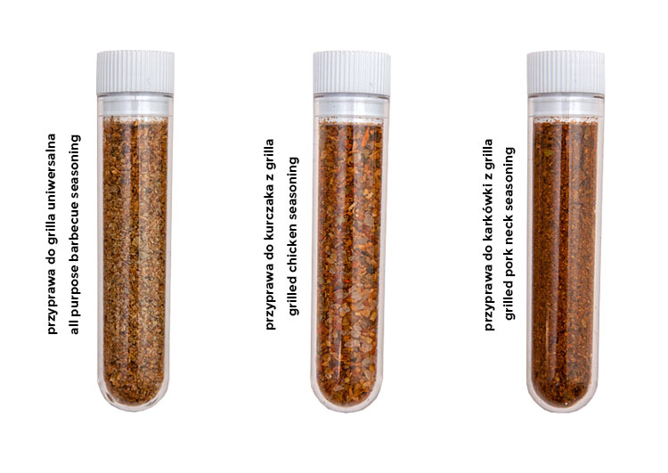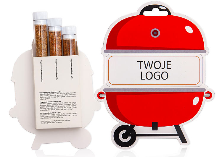 - trzy przezroczyste fiolki z przyprawami do najpopularniejszych dań z grilla: uniwersalna, do kurczaka, do karkówki
