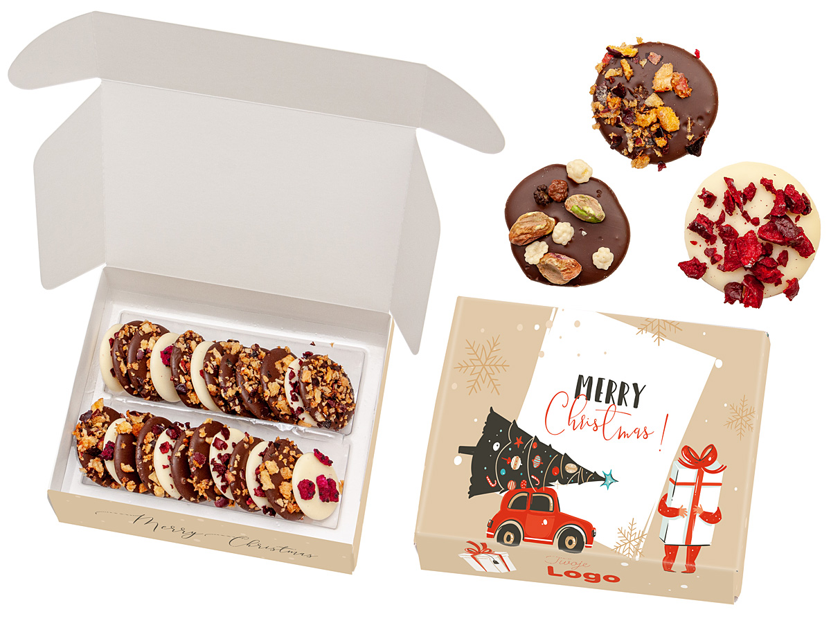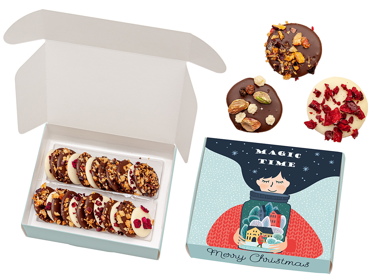 • 24 szt. talarków z wyśmienitej czekolady mlecznej 44% oraz białej, ozdobionych różnymi owocami liofilizowanymi, posypkami czekoladowymi i orzeszkami