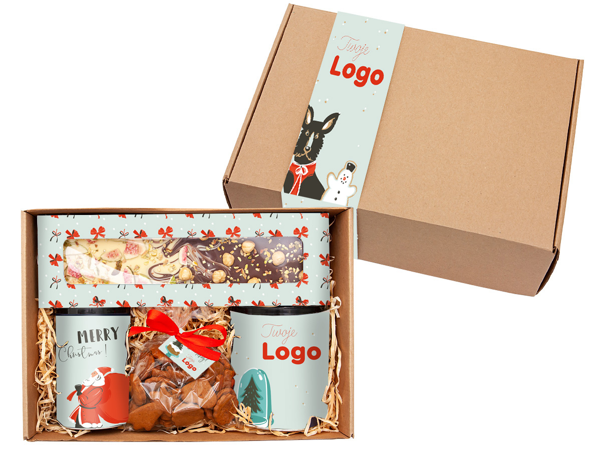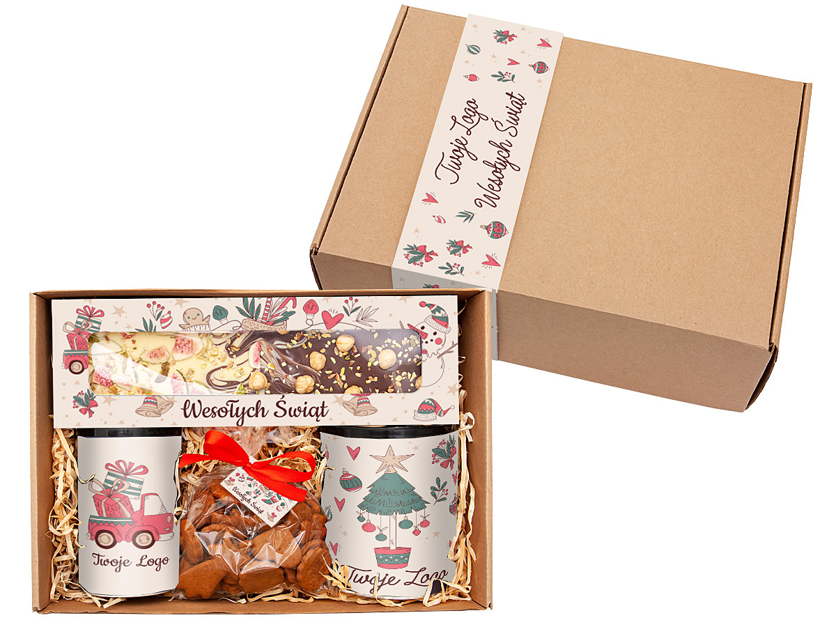 - zawartość zestawu: herbata liściasta świąteczna w tubie 50g (czarne wieczko), kawa mielona w tubie 250g (czarne wieczko), Czekolada Bajeczna 250g (połączenie czekolady mlecznej 44% z białą posypana liofilizowaną figą, orzechami laskowymi oraz pokruszonymi pistacjami), aromatyczne pierniczki w torebce 140g
