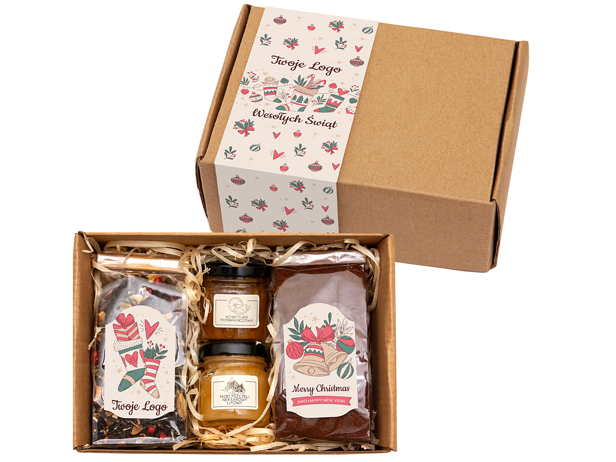 • zawartość zestawu: herbata liściasta świąteczna 50g (herbata czarna z anyżem, migdałami w płatkach, goździkami, maliną liofilizowaną oraz płatkami róży), kawa mielona 65g, konfitura pomarańczowa 40g, miód pszczeli nektarowy lipowy 40g