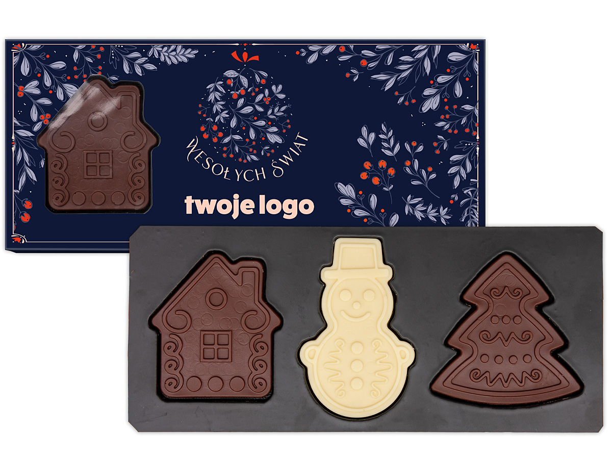 - czekoladka w kształcie domku oraz choinki wykonana z czekolady mlecznej 44%, bałwanek wykonany z czekolady białej